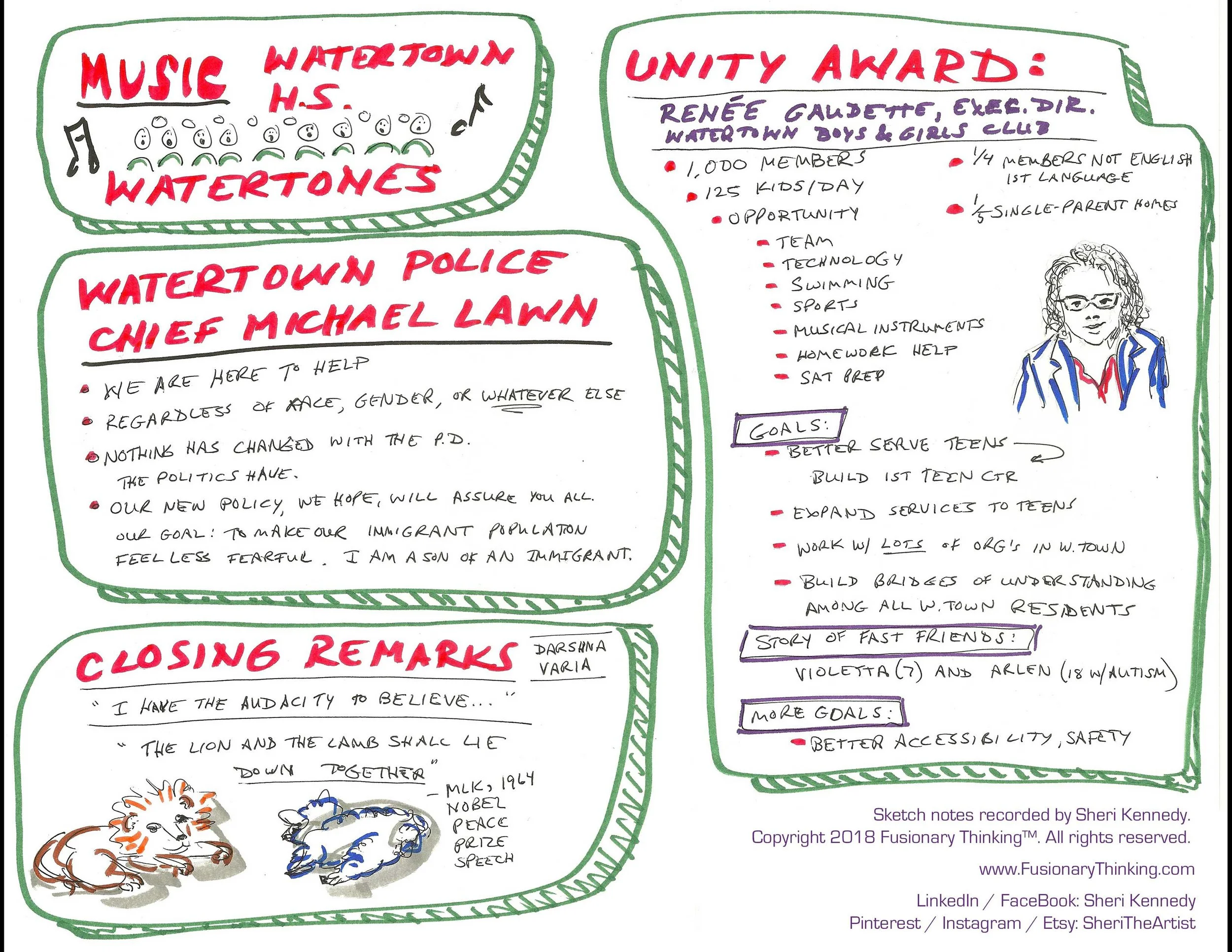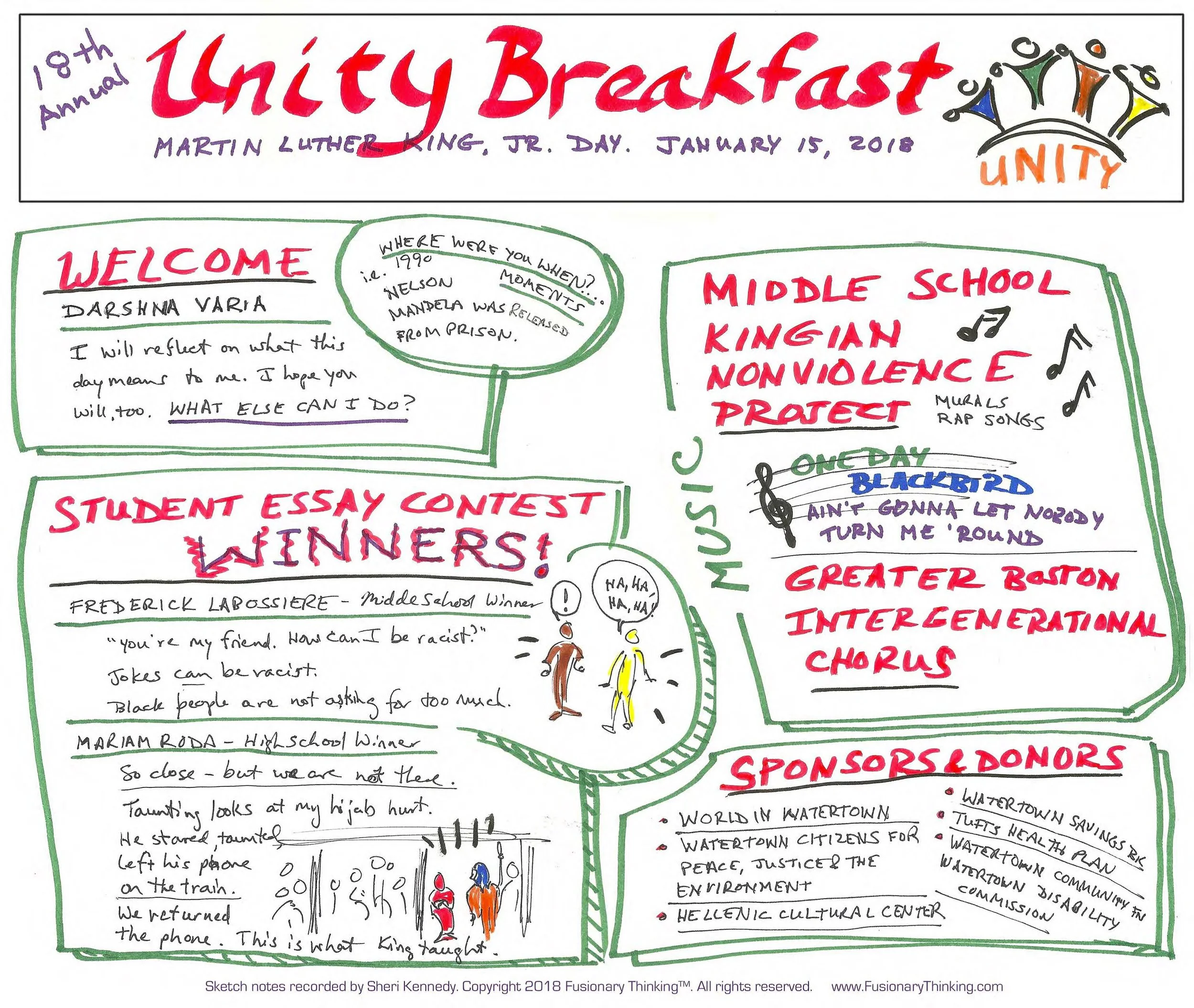 Something new this year...colorful and creative "sketch notes"created by local artist Sheri Kennedy. These visual notes integrate text and illustrations to capture the ideas, energy, and spirit of the 2018 Unity Breakfast.